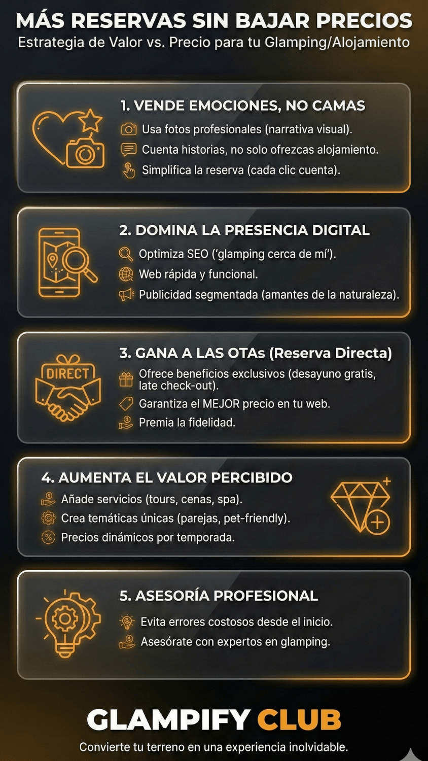 En GlampifyClub ayudamos a nuestros clientes a diseñar experiencias que se venden solas, integrando valor, autenticidad y diseño sostenible.
