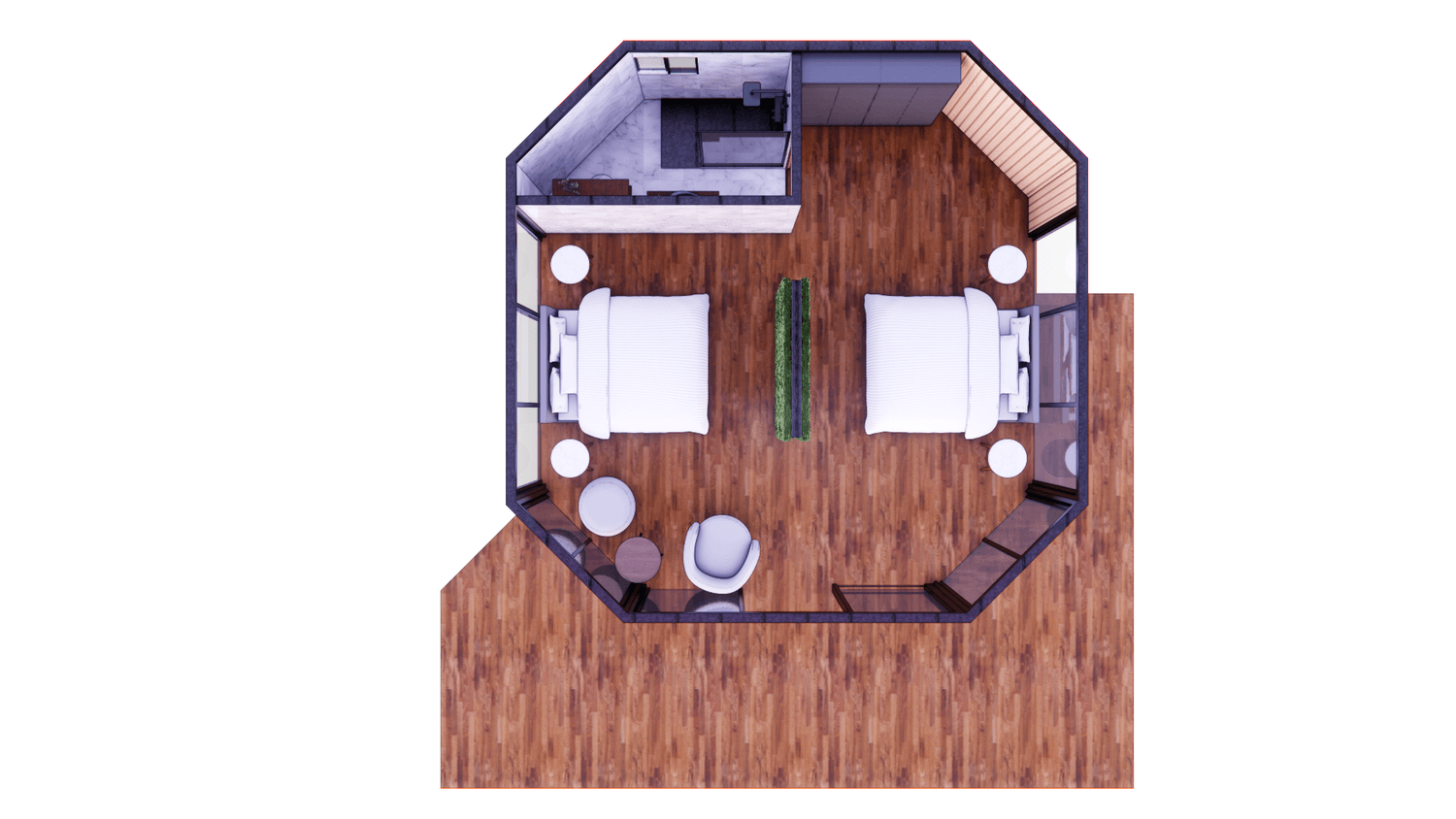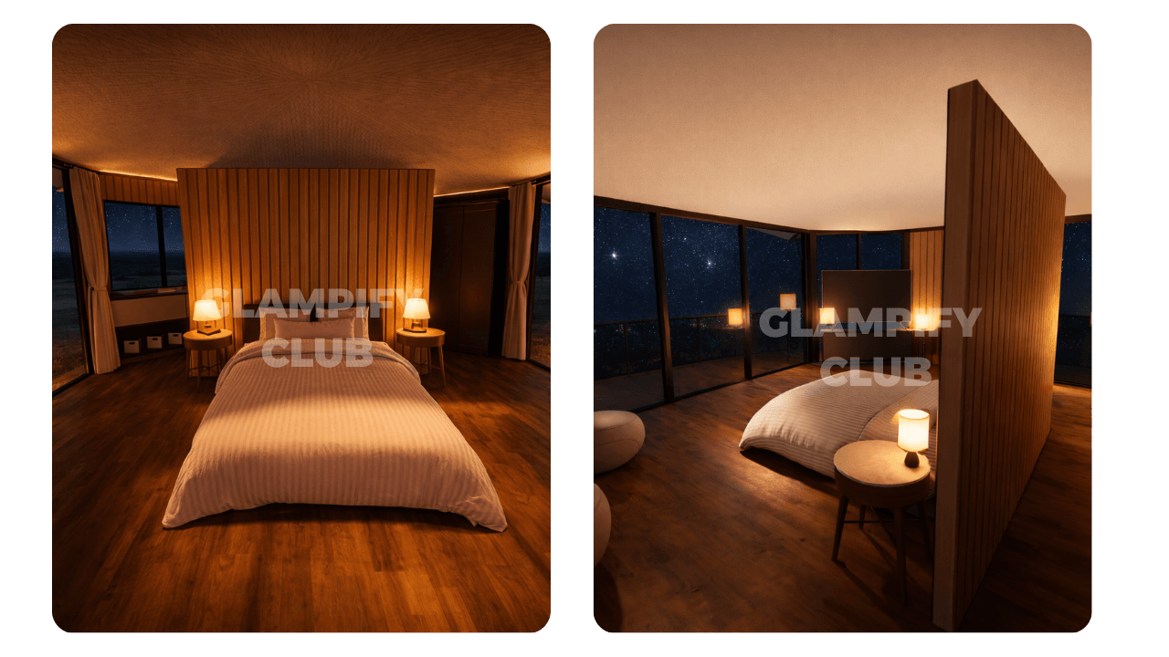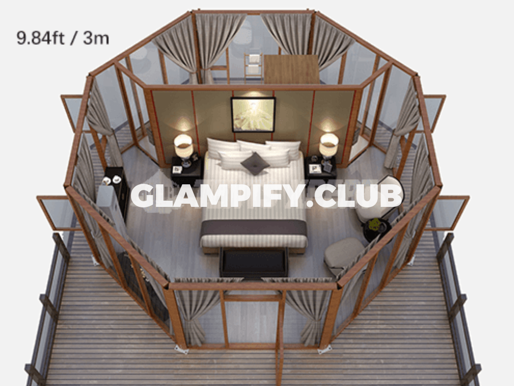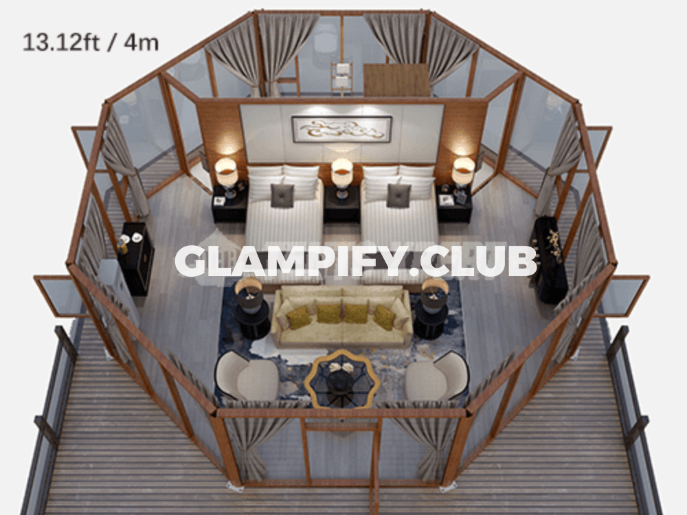 Claro. Si bien proporcionamos sugerencias de diseño estándar. El interior de la Casa Octogono Logde Tent es muy flexible y se puede personalizar para adaptarse a diferentes funciones, ya sea un espacio familiar acogedor, un retiro de lujo para parejas o una suite glamping de usos múltiples con salón y cocina.